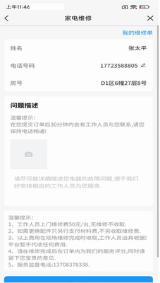 2. 物业响应中心24小时在线受理报修,维修进度可视化追踪功能