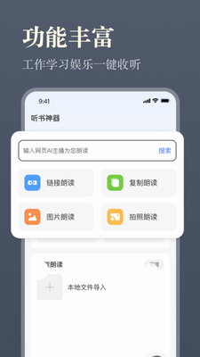 1、无限量下载模式打破内容壁垒,用户可自由获取全网优质有声资源。2、独创多场景适配系统,智能识别网页文字与实体书籍内容,支持跨平台内容收听。3、配备22种AI合成音色库,包含专业播音腔、方言特色音及网络热门声线,用户可依据作品风格自由切换主播音色。