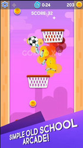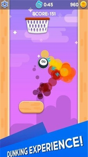 该作突破传统投篮游戏模式,创新加入动态篮筐机制。玩家需在0.5秒反应时间内预判落点,通过三阶段蓄力系统控制投篮力度,精准命中可触发彩虹轨迹特效。20款特色篮球皮肤可通过赛事积分兑换,每款皮肤附带专属得分加成,黄金皮肤更可提升15%金币获取效率。