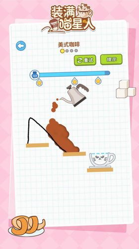 1、突破传统解压游戏模式,采用物理引擎模拟液体流动轨迹,每条画线都将影响咖啡倾倒路径