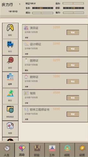角色六大基础属性构成成长基石:IQ决定学习效率,EQ影响社交质量,精力值管理系统控制行为频次,学习能力关联技能掌握速度,健康值可视化生命状态,压力值需要定期释放。通过户外运动、旅行度假等二十余种解压方式,维持身心健康平衡。
