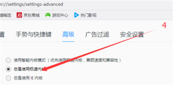 3、切换至[高级]设置模块,这里包含浏览器内核管理、硬件加速等深度优化项目,建议用户谨慎调整其他参数