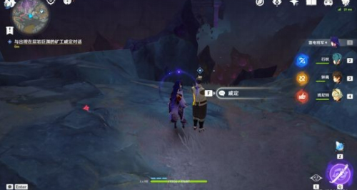 3、特殊地形识别技巧:目标点位于倒悬钟乳石群下方平台,此处地面有明显人工开凿痕迹。靠近岩壁处可见跪坐状态的NPC戚定,其身旁散落着破损的采矿工具。