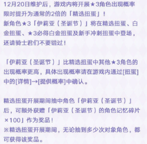 该角色于2021年12月20日版本更新后加入「精选扭蛋」卡池,玩家可通过消耗宝石进行抽取。卡池特别设置三星角色出现率双倍提升,且圣诞伊莉亚享有优先概率权重。成功召唤角色时可额外获得100枚专属记忆碎片,大幅降低升星培养的资源消耗。建议玩家把握活动周期集中资源抽取,结合每日免费单抽提高获取效率。