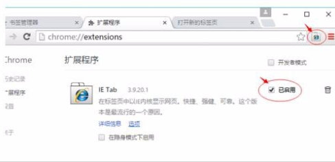7、返回扩展程序管理界面,找到已安装的IE Tab插件,确保其右侧的启用开关处于打开状态。部分版本可能需要手动勾选"允许访问文件网址"等权限设置。