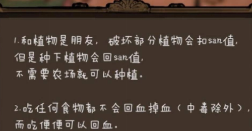 1、角色与生态系统存在特殊交互机制,当周围植被遭受破坏时将触发精神值衰减(每次-5点),而成功播种作物可恢复10点精神值。这种双向调节机制要求玩家精准把控植被管理节奏,建议随身携带批量种子进行环境改造。