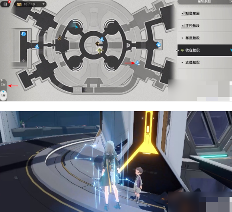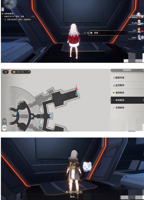 1、启动任务后需前往主舱段核心区域,坐标为空间站中层枢纽区(具体坐标参考示意图)。在此区域与值班科员展开对话,通过选择「异常声响」相关对话选项获取线索,系统将标记出需要探查的声源区域。