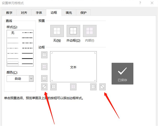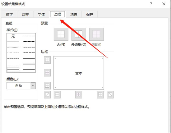 2、在格式设置窗口顶部导航栏选择「边框」选项卡,此时界面将显示边框编辑工具组