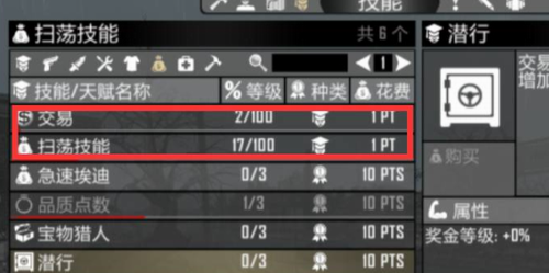 物资搜寻技能建议保持三级强化,该项提升的150点品质上限远超工作台的25点合成增幅。对于专业搜刮者,初期投入60点即可满足基础需求,后期逐步补满效果更佳。交易大师技能在当前版本经济系统下性价比较低,建议保留技能点数用于其他关键领域。