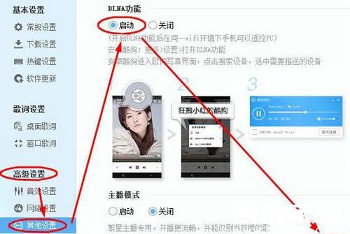 在设置界面选择"高级设置"分类,进入"其他设置"子菜单后,可见DLNA功能开关选项,勾选"启动DLNA"即可完成配置。