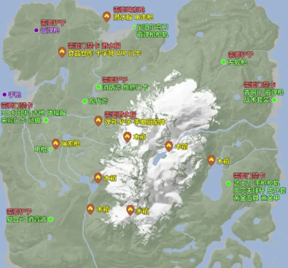 武器装备库数据显示当前版本包含27种可收集器械,其中现代斧(坐标X:342,Y:109)与复合弓(需完成3个献祭仪式)为T1级近战/远程武器。特殊装备呼吸器(沉船货舱)与电击棒(实验室B区)可显著提升洞穴探索效率。