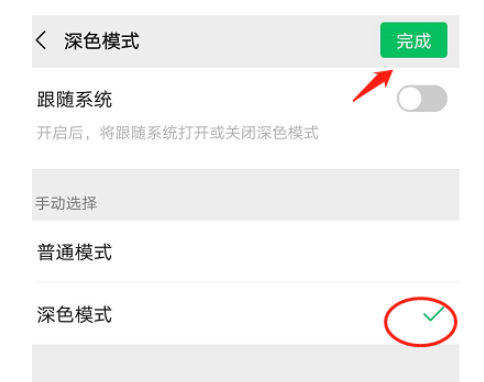 5、在模式选择界面勾选"深夜模式"选项,确认后点击完成按钮