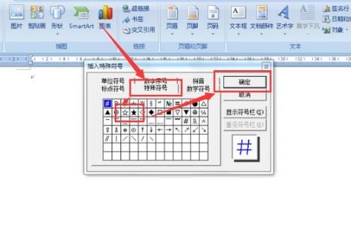 4、选定目标符号后双击或点击确认按钮,即可将五角星插入文档指定位置
