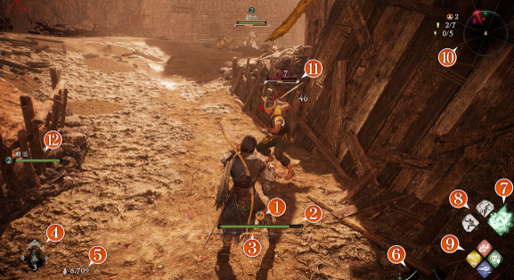 - 生存指标:红色血条代表生命值,蓝色气槽展示气势状态