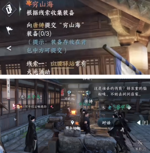 2、拾取穷山海残件后将解锁系列线索提示。此时需返回汴京主城寻找铁匠宗师唐铸进行对话,该NPC会要求少侠收集三件关键锻造素材。