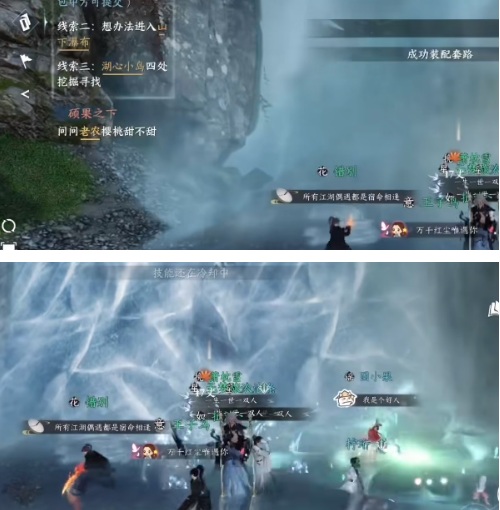 3、根据首条线索指引前往雷鸣瀑布区域。在瀑布前使用寒冰真气击破水幕机关,待水流暂时中断时迅速潜入后方山洞开启玄铁宝箱。