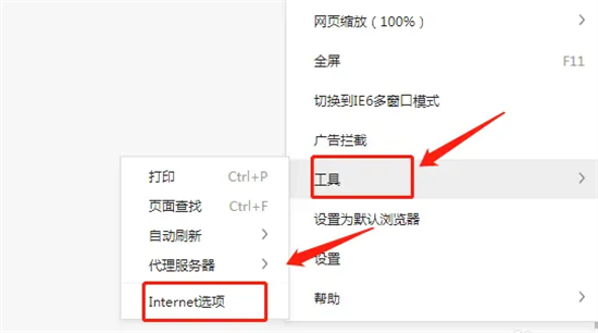 2、在展开的二级导航面板中,选择「工具」分类标签。该菜单集成了浏览器的基础配置与扩展管理功能,通过点击「Internet选项」可进入核心设置界面。