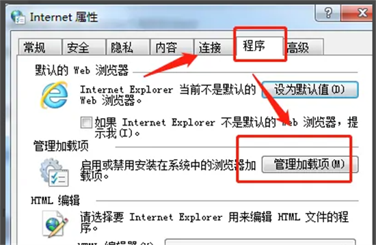 3、系统将弹出包含多个配置模块的属性窗口,此时需切换至顶端「程序」选项卡。在该分页中找到「管理加载项」功能按钮,此操作将展示浏览器当前安装的所有扩展组件列表。