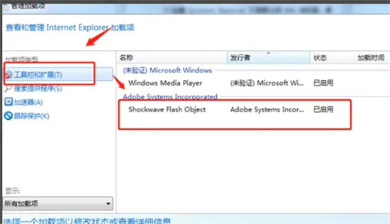 4、在加载项管理界面,需特别注意「工具栏和扩展」分栏右侧的组件列表。通过滚动查找标有Shockwave Flash字样的条目,使用鼠标右键调出操作菜单后,点击「启用」选项即可完成功能激活。建议操作完成后重启浏览器使配置生效。