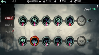 4、点击技能槽会弹出已解锁的奥义列表,未满足使用条件的技能会显示灰色锁定状态