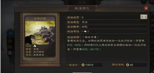 2、百骑劫营战术配合:该突击型战法在普攻后触发双重打击,首段对主目标造成154%伤害,次段60%概率追加122%伤害。搭配许褚的锁定机制可实现精准补刀,特别在对抗带有治疗或减伤阵容时,能有效突破敌方防御体系。建议与强攻类战法形成组合,通过连击效果提升触发频率。